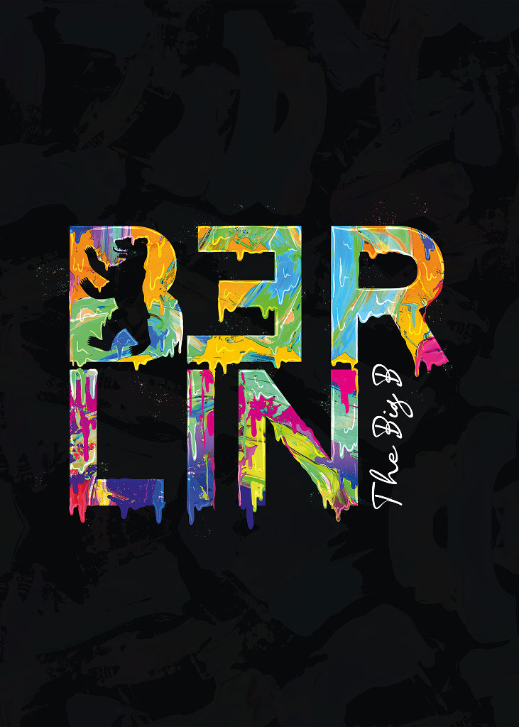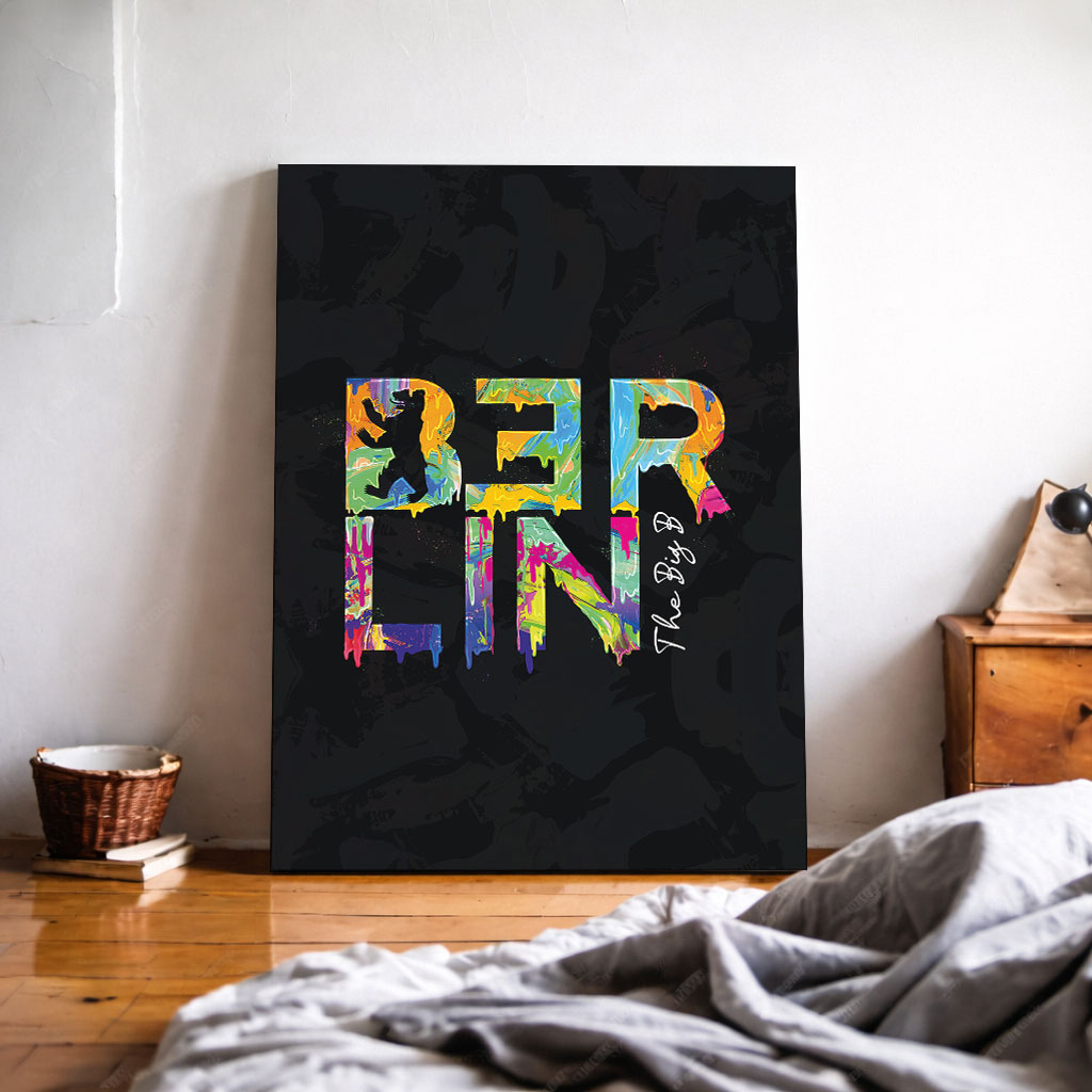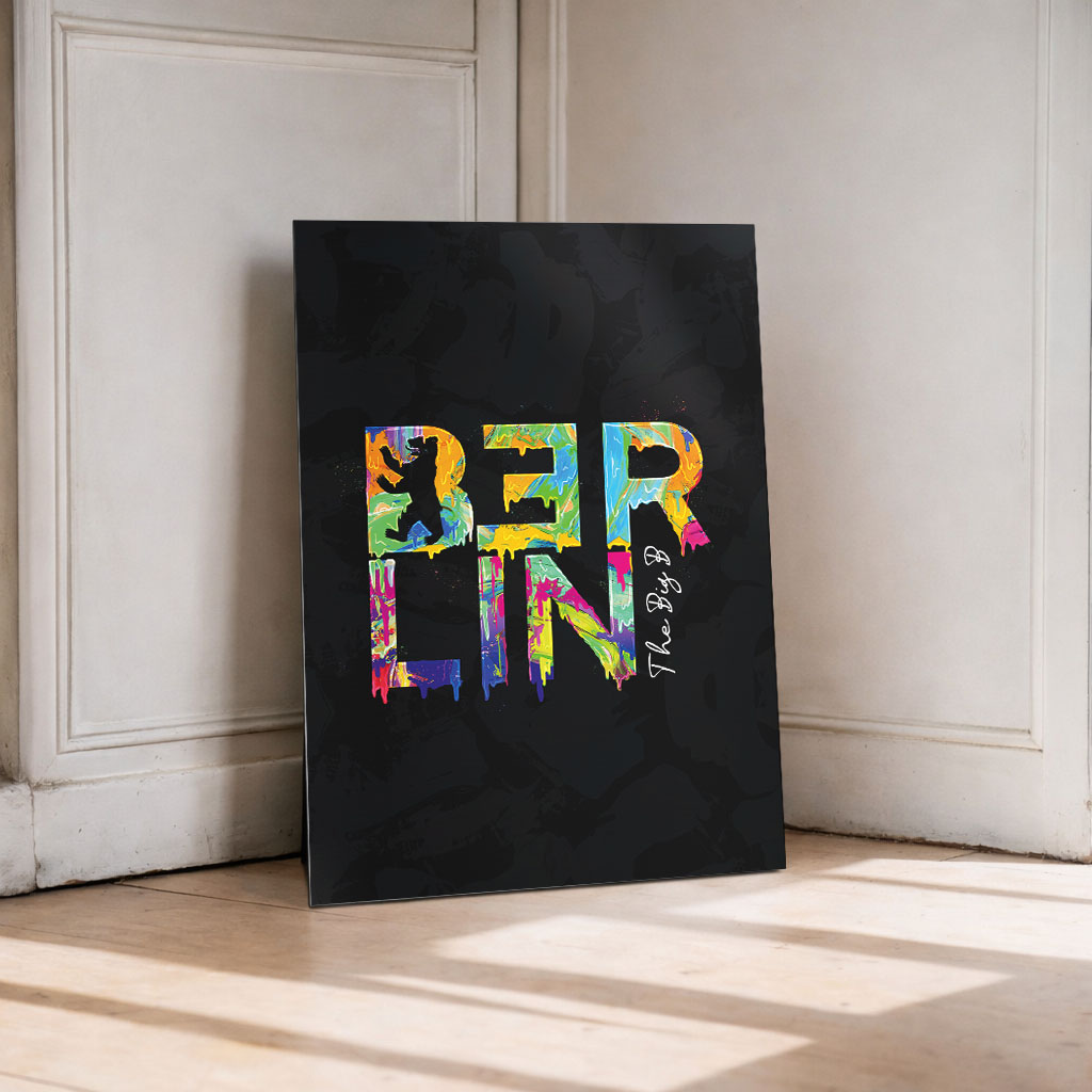 Berlin Typo in Farbe zeigt ein ausdrucksstarkes Berlin Typografie Poster mit urbaner Farbstruktur auf schwarzem Hintergrund. Moderne Stadtkunst mit klarer Typografie – erhältlich als Poster, Leinwand oder Alu-Dibond für urbane, moderne Räume.