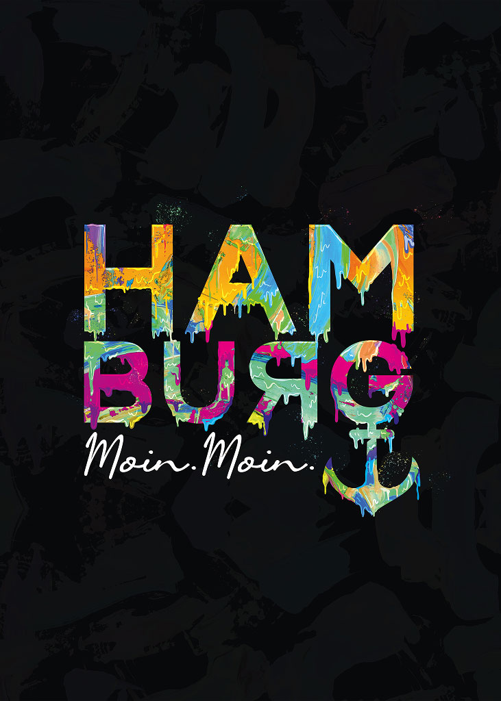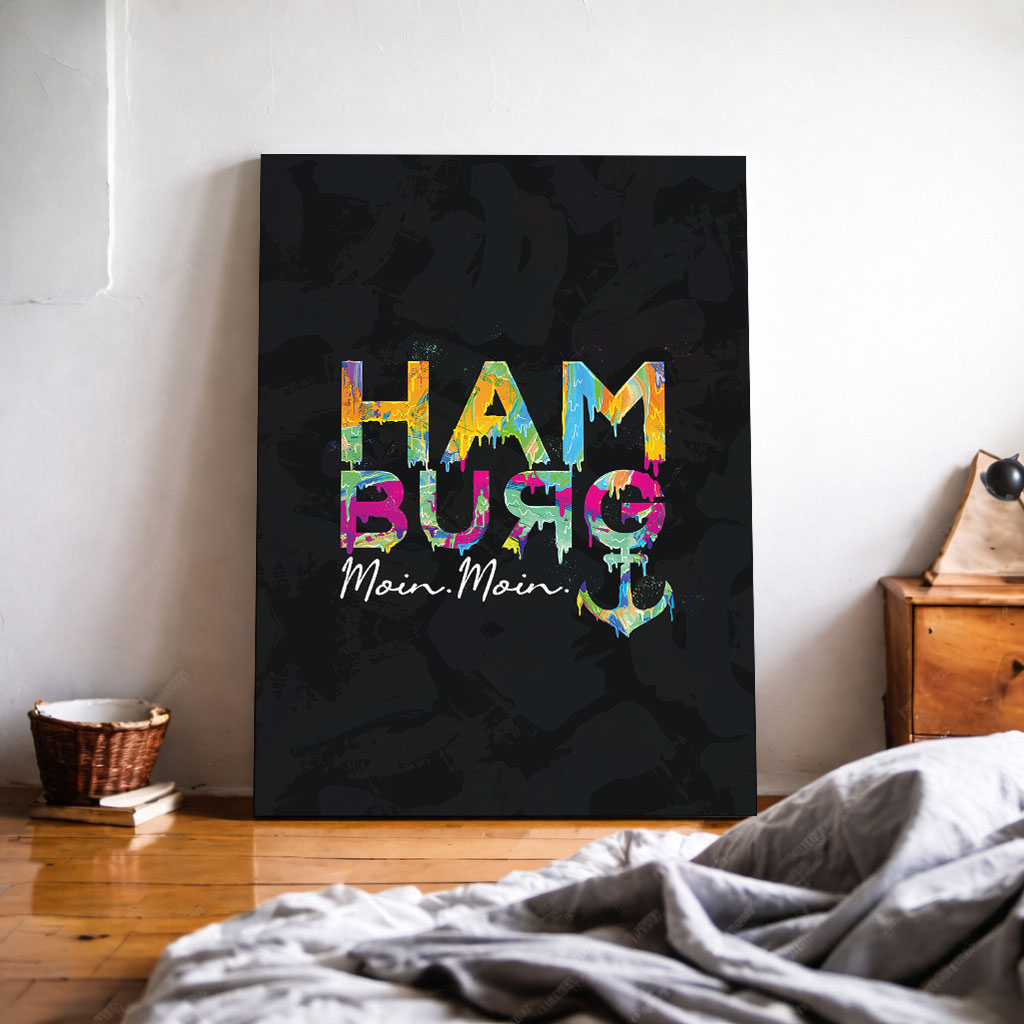 Hamburg Typo in Farbe zeigt ein ausdrucksstarkes Hamburg Typografie Poster mit urbaner Farbstruktur auf schwarzem Hintergrund und dem Zusatzschriftzug „Moin Moin“. Moderne Stadtkunst mit klarer Typografie – erhältlich als Poster, Leinwand oder Alu-Dibond für urbane Räume.