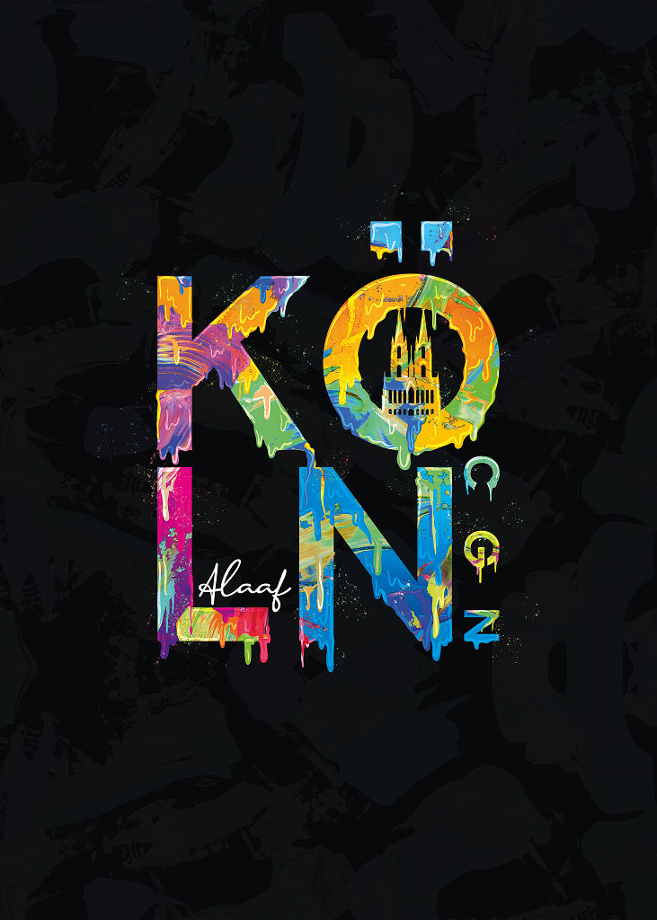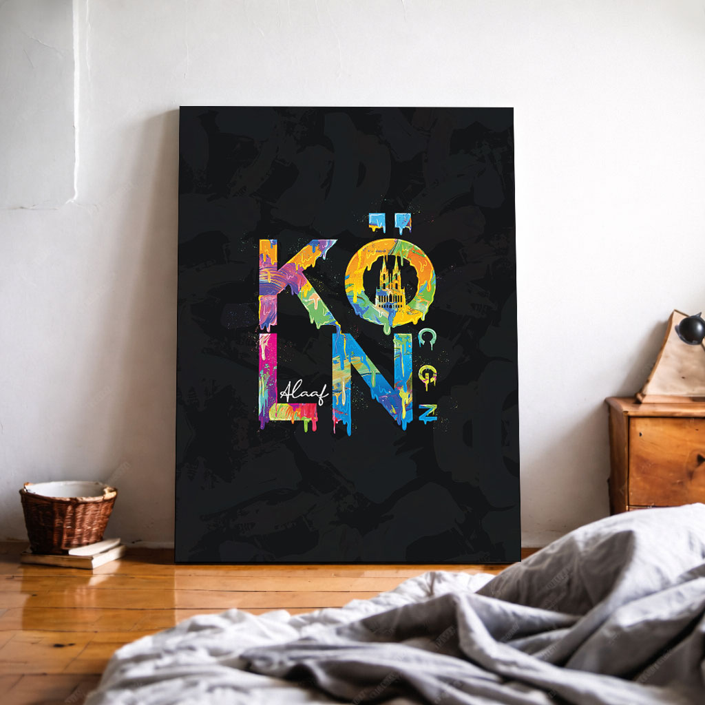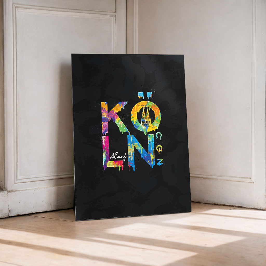 Köln Typo in Farbe zeigt ein buntes Köln Typografie Poster mit farbintensiver Typografie auf schwarzem Hintergrund. Das moderne Stadtkunst-Motiv verbindet urbane Energie mit klarer Schriftgestaltung – erhältlich als Poster, Leinwand oder Alu-Dibond für urbane Räume.