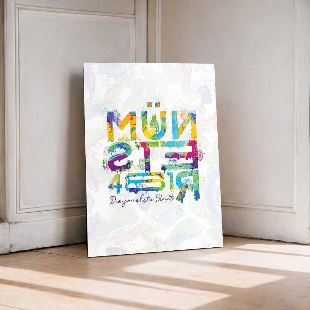 Münster Typo in Farbe zeigt ein modernes Münster Typografie Poster mit farbintensiver Typografie auf weißem Hintergrund. Klare Stadtkunst mit urbanem Charakter – erhältlich als Poster, Leinwand oder Alu-Dibond für helle, moderne Räume.