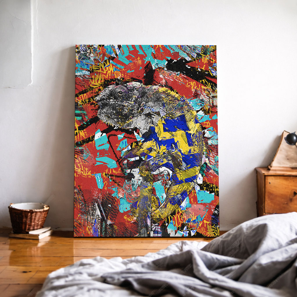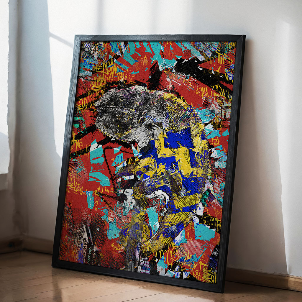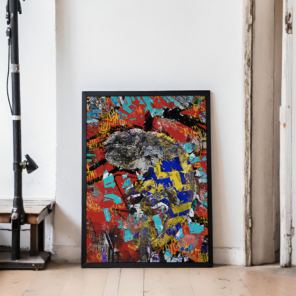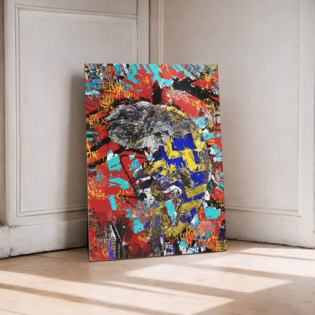 Urban Adaptation zeigt ein ausdrucksstarkes Urban Art Chamäleon im farbintensiven Graffiti Stil. Das Motiv steht für Anpassung, Wandel und urbane Energie – moderne Tierkunst als Poster, Leinwand oder Alu-Dibond für charakterstarke Räume.