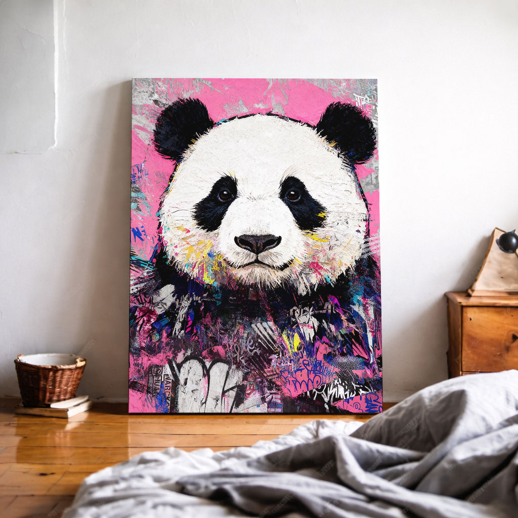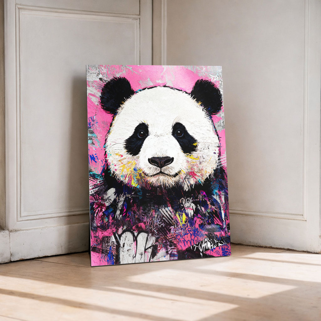 Calm in Chaos zeigt einen ruhigen Urban Art Panda im modernen Street Art Stil. Das Motiv steht für Gelassenheit im Chaos und verbindet sanfte Ausstrahlung mit urbaner Energie – moderne Tierkunst als Poster, Leinwand oder Alu-Dibond für ausgeglichene Räume.